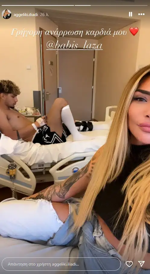 «Γρήγορη ανάρρωση καρδιά μου», έγραψε στη φωτογραφία η Αγγελική Ηλιάδη βάζοντας μια κόκκινη καρδιά, εκφράζοντας όλη της την αγάπη για τον μεγάλο της γιο, Μπάμπη Λαζαρίδη.
