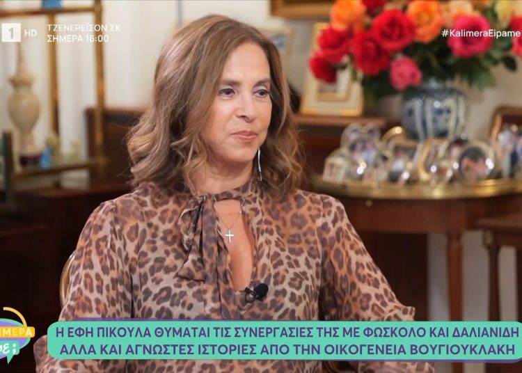 Η Έφη Πίκουλα μίλησε στην εκπομπή της ΕΡΤ1 «Καλημέρα είπαμε;» και στον δημοσιογράφο Κωνσταντίνο Αρκά, ανοίγοντας την καρδιά της για την προσωπική της ζωή, την απώλεια του συζύγου της Τάκη Βουγιουκλάκη, αλλά και για τις τελευταίες στιγμές της Αλίκης Βουγιουκλάκη.