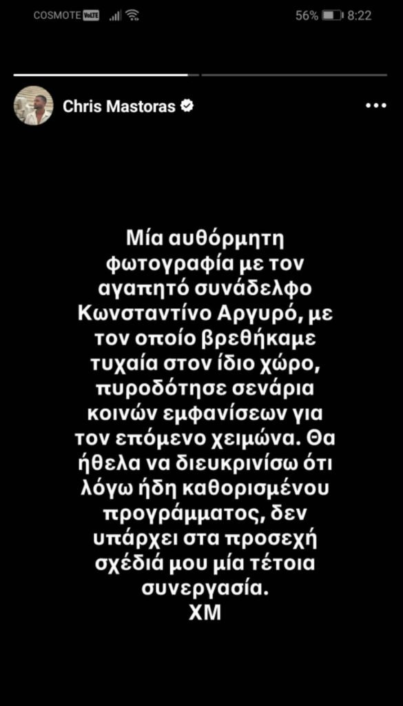 Μια ανάρτηση του Χρήστου Μάστορα στα social media έβαλε τέλος στις φήμες που τον ήθελαν να συνεργάζεται με τον Κωνσταντίνο Αργυρό.